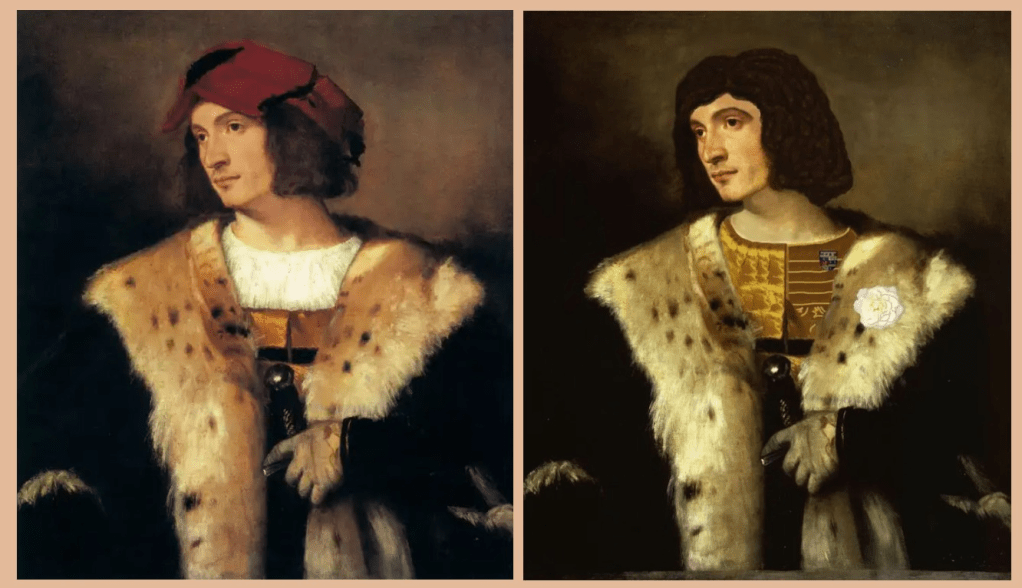 Some time ago I posted about a painting called Portrait of a Man in a Red Cap from this exhibition by Titian, which I’d “adapted” to become a portrait of John de la Pole, Earl of Lincoln. This adaptation has popped up all over the place since then, and now I’ve happened upon it again – captioned “Victorian painting of John de la Pole”. Really? I’m sure that Titian, already displeased with me, will now be doubly displeased! Sharpened brushes will surely be raining down from on high, so I’d better stay inside until he gets over it.
