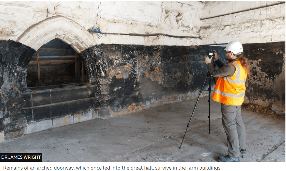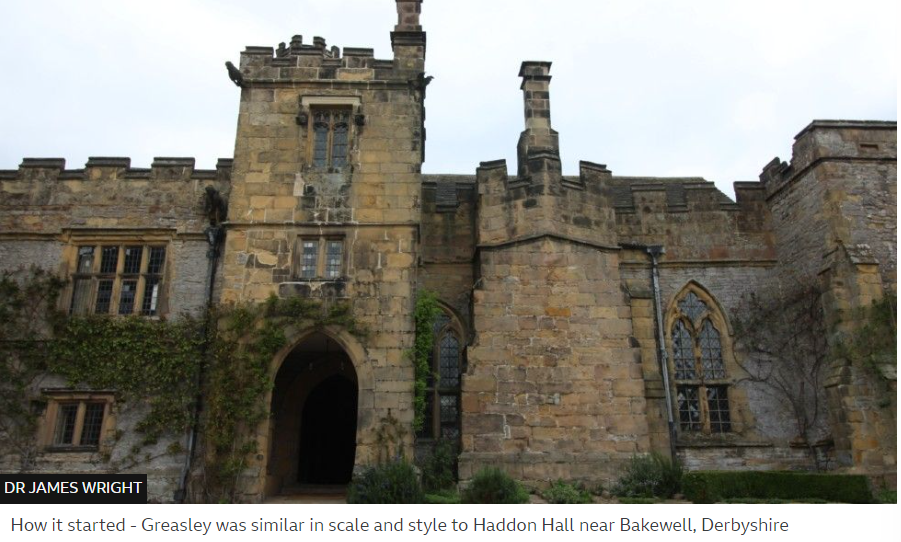 I have to say that Greasley isn’t a castle that comes easily to mind, even though a former occupant fought for Richard III at Bosworth. It’s in Nottinghamshire, dates to the 14th century, and was larger and more opulent than Haddon Hall, which I do know, of course. A certain Nicholas de Cantilupe built it (see here) and it played host to an Archbishop of Canterbury, yet today all you see is “a set of ramshackle farm buildings”. Excavations there are revealing evidence of its former grandeur.