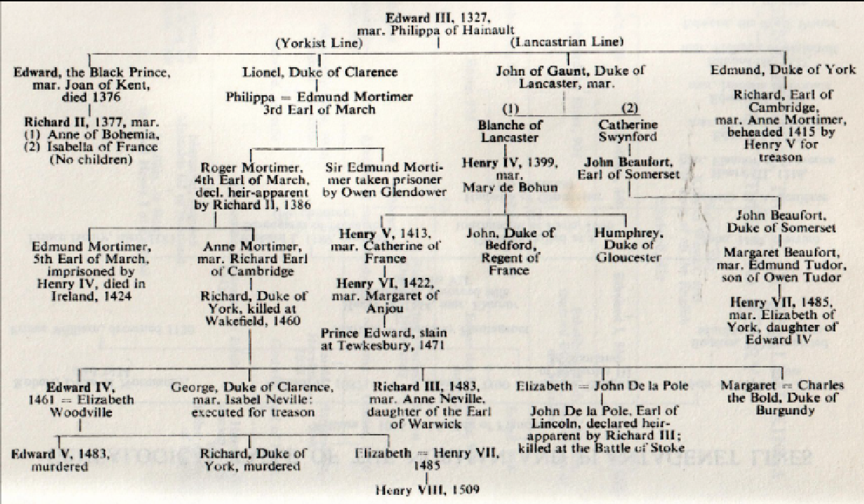 Seldom was this more important than in the case of Philippa of Clarence, only daughter of Lionel of Clarence, second son of King Edward III. Lionel was next brother to Edward of Woodstock, the Black Prince, who left only one small son, Richard of Bordeaux, to inherit the crown of Edward III. The next brother to Lionel was John of Gaunt, Duke of Lancaster. Then came Edmund of Langley, Duke of York, and finally Thomas of Woodstock, Duke of Gloucester.