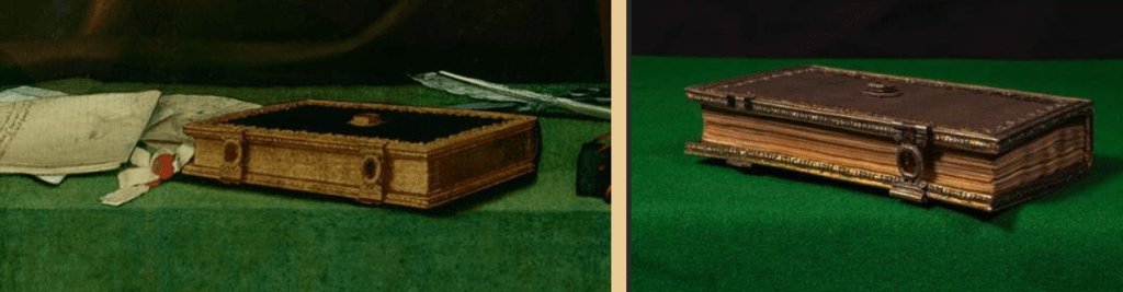 It is believed, but not yet proven, that all three books are copies of one original. I haven’t been able to find out which book was copied. And it would have been the covers, clasps etc. only the pages within. Dating each one can’t be simple either. The Holbein portrait was painted 1532/3 and Cromwell died 1540. Catherine of Aragon and Anne Boleyn both died in 1536. Without knowing when the books were created/acquired, it’s hard to say which book might have been the original.