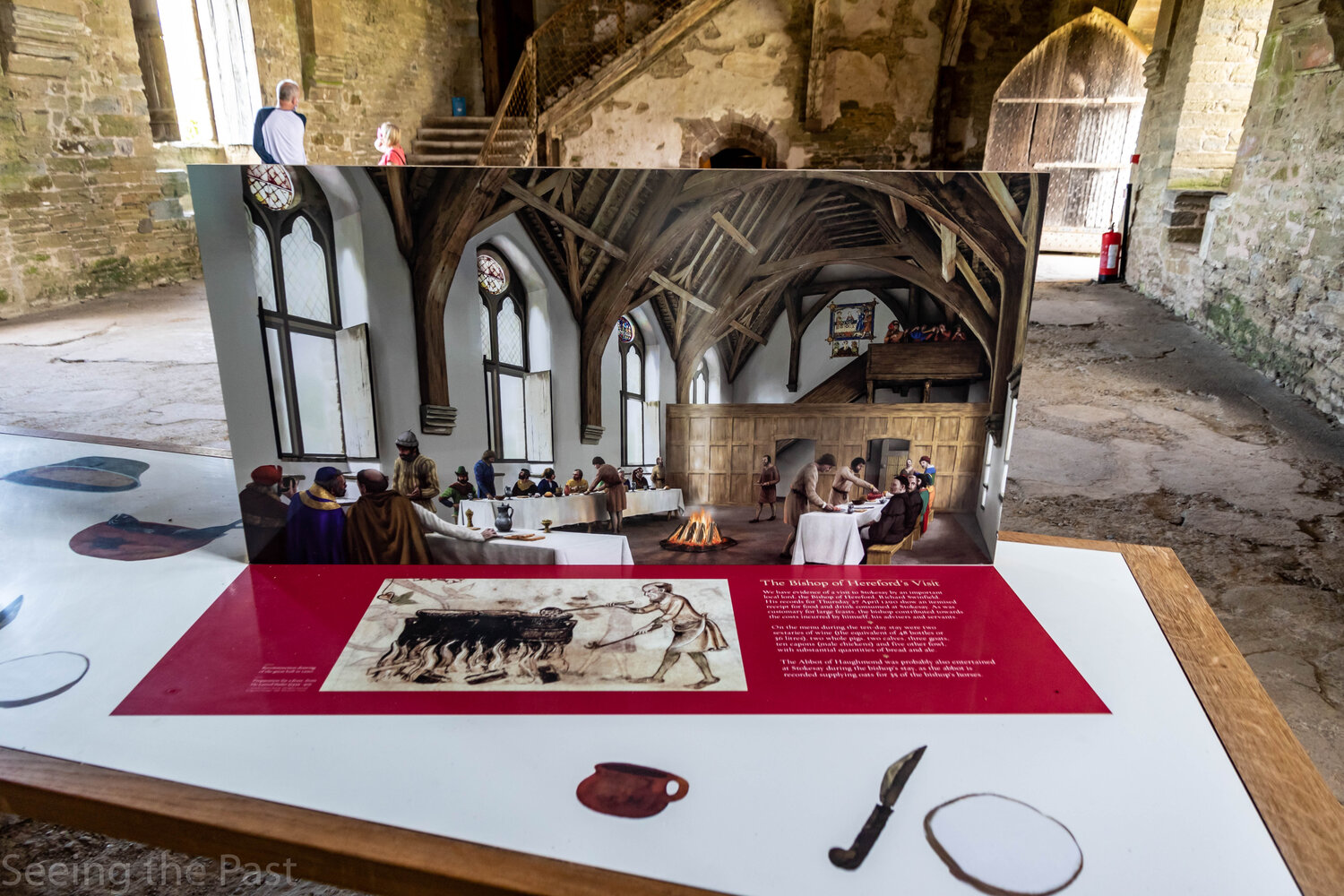Go to this blog to see lots of pictures, including an imagined scene in the great hall during a ten-day visit by the Bishop of Hereford in 1290. The only decent reproduction of this scene that I can find is shown below and is from the above link. The site also lists the eye-boggling amount of food that was consumed during this visit. I imagine the owners were glad when their illustrious guest moved on!