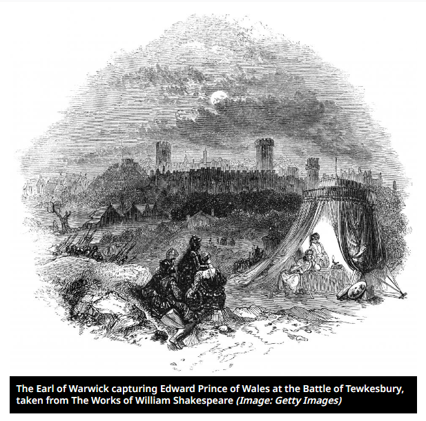 The article states that “Shakespeare takes liberties with Tewkesbury” (and calls Richard III a scallywag!) and then lists all the things that are wrong in the Bard’s accounts. But it doesn’t notice the glaring error in the above illustration’s caption. I’d like to know how Warwick captured anyone at Tewkesbury when he’d died the previous month at Barnet! Oops!