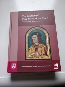 Here it is at last, a publication sponsored by the Society of Antiquaries and the Richard III Society. Over forty years after his last edition of Buc‘s magnum opus, Arthur Kincaid has managed to remove the “wrapping paper” added by the author’s less painstaking great-nephew and namesake so that only the original remains. Through the many introductory chapters, we can read of Sir George’s descent and precise relationship to his “editor”, as well as how so many later authors confused his own meticulous work, conversations with heralds and personal recollections (viva voce, including his Howard connections) led manuscript with the bastardised version that emerged over two decades after his death. Buc’s work has rested for centuries, under a bust of Tiberius, in the library of his fellow antiquary Sir Robert Cotton, where a 1731 fire and other adverse events damaged it, particulary in the margins which he had much used for annotation. He was the first to rediscover Titulus Regius from Crowland, thereby disproving More‘s substitution of “Elizabeth Lucy” for Lady Eleanor Talbot in the pre-contract.