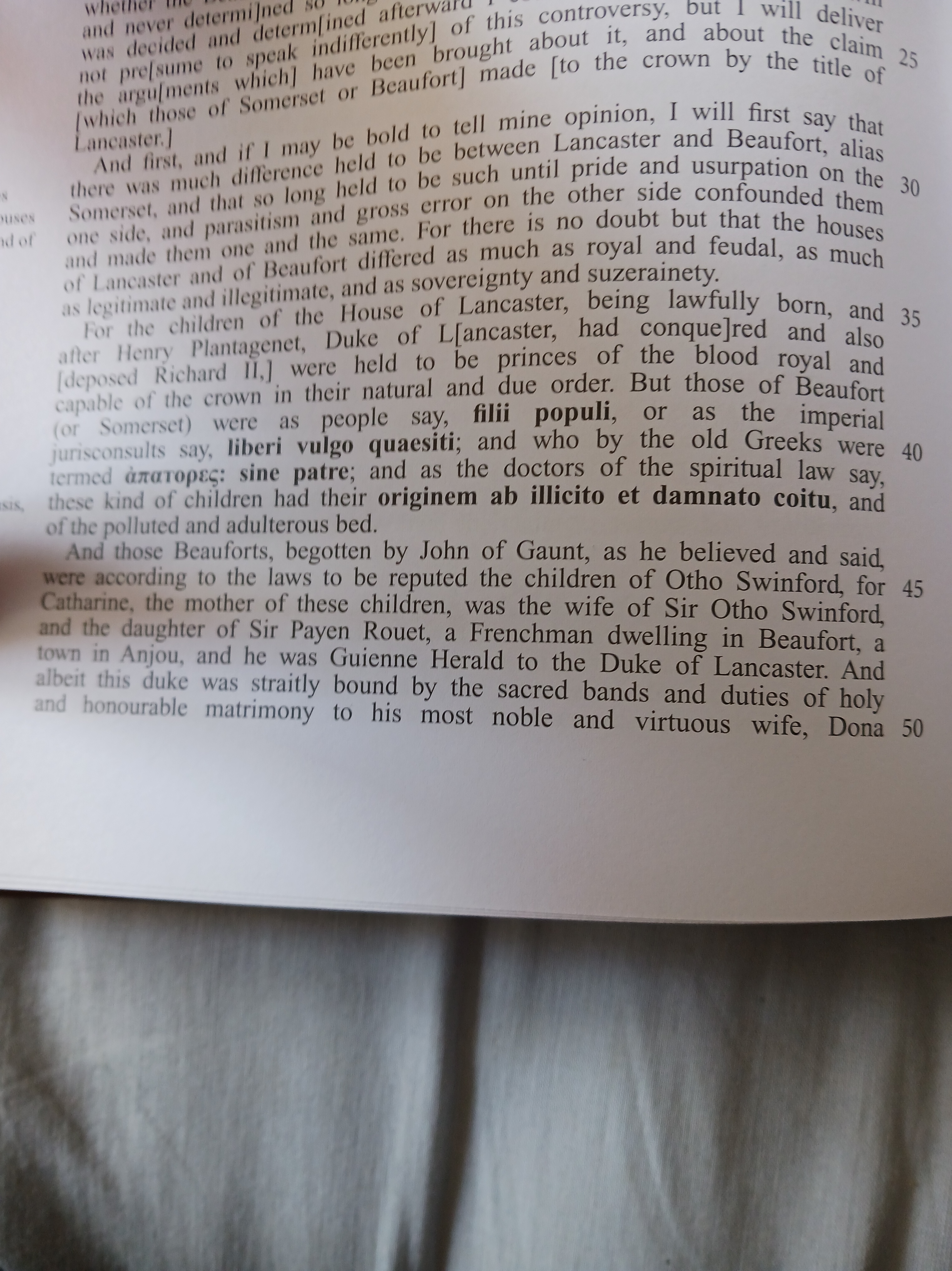 So that is the 160 or so introductory pages, but what of the core content? It is divided into five books and the first two describe Richard’s reign and the “Tudor” invasions leading to Bosworth, after which Buc’s great-grandfather was beheaded. There are many Latin quotations and much genealogy, although he counts Hereward and the Bigods as ancestors of the Howards, for which there seems not to be evidence. There is a good explanation of what makes a true Lancastrian (ie not a Beaufort) and the status of royal bastards, together with a note on the Statute of Merton (left) as it affected the Swynford/ Beaufort case. There is also a little confusion between the later Stewart kings. The third and fourth books cover the evidence in the “Perkin” case and for the pre-contract, whilst the last part is a general conclusion about Richard’s ancestry and character.