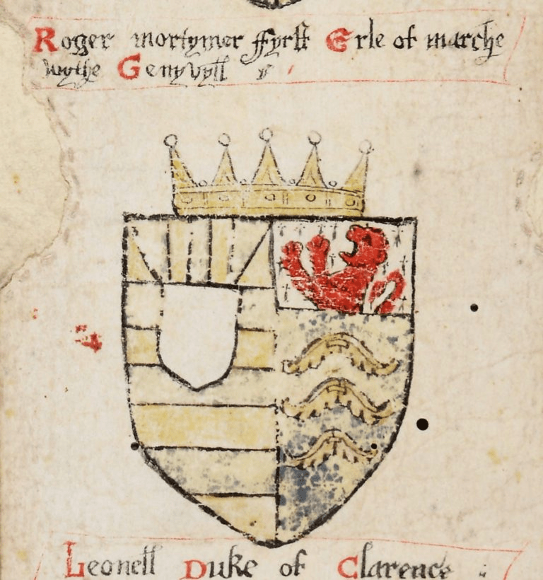 The shield depicted, which belongs to the Heraldic Roll of Ludlow Castle (and which can be seen at the castle) is that of Roger Mortimer, first Earl of March and his wife Joan de Geneville.