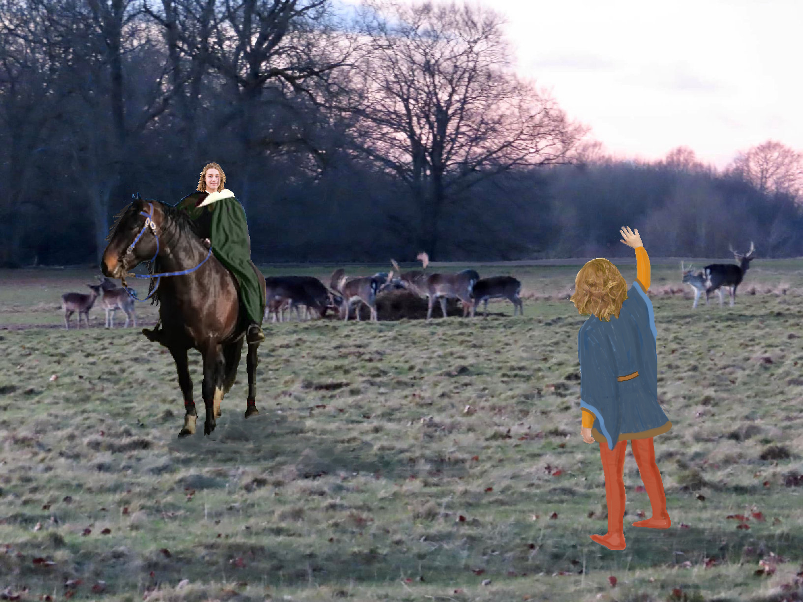 Figure 6: The setting is my daughter’s photograph of deer at Barrington in the Cotswolds. The man on the horse is adapted from- https://www.youtube.com/watch?v=JOGQ2NcZzKs. The boy is a much altered modern photograph, no source available.
