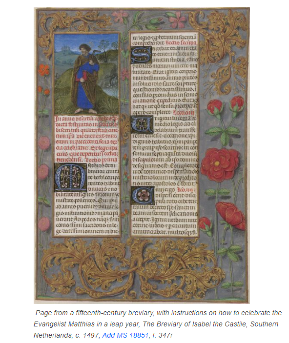 Placing another day at the end of February (every four years) is, apparently, a comparatively recent way of doing it. From Caesar into the medieval period there seems to have been an extra 24 February! So, there’d be 23 February, 24 February, 24 February, 25 February and so on. Lucky St Matthias/Matthew, the leaping saint. Two days to himself! Bet the others were jealous.