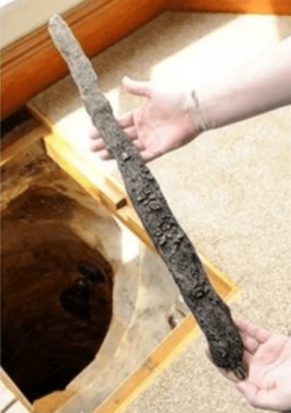 A ring and a coin from 1725 have been found in the well, but the ring is undated. The other discovery is what is said to be either a sword or a sheath. The image below shows this item, and is the only image I’ve been able to find. It’s from this site. I’m no expert, but it looks like a long blade, and so is presumably that of a sword.
