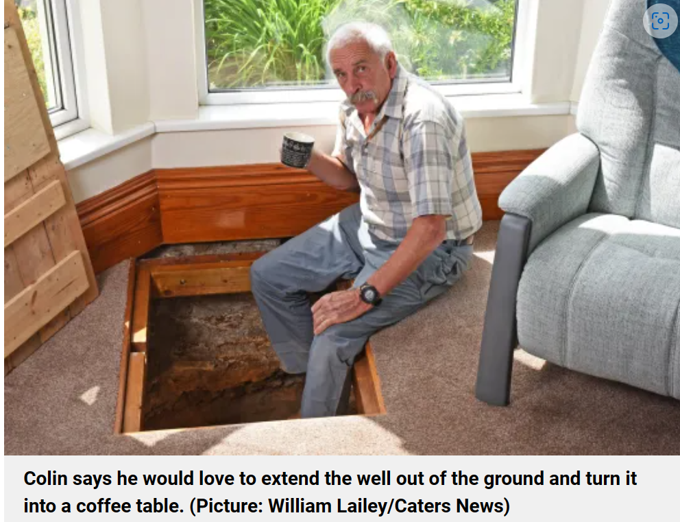 I find this story quite discomforting. Just the thought that merely crossing your living room might result in falling through the floor into a 15th-century well is enough to give me the shivers. Mind you, if I noticed a dip in the floor I’d have had it inspected a little more promptly than the ten years it took this gentleman in Plymouth. He knew about such things as sinkholes! My daughter lives in a house like this, but—thankfully—she’s moving!
