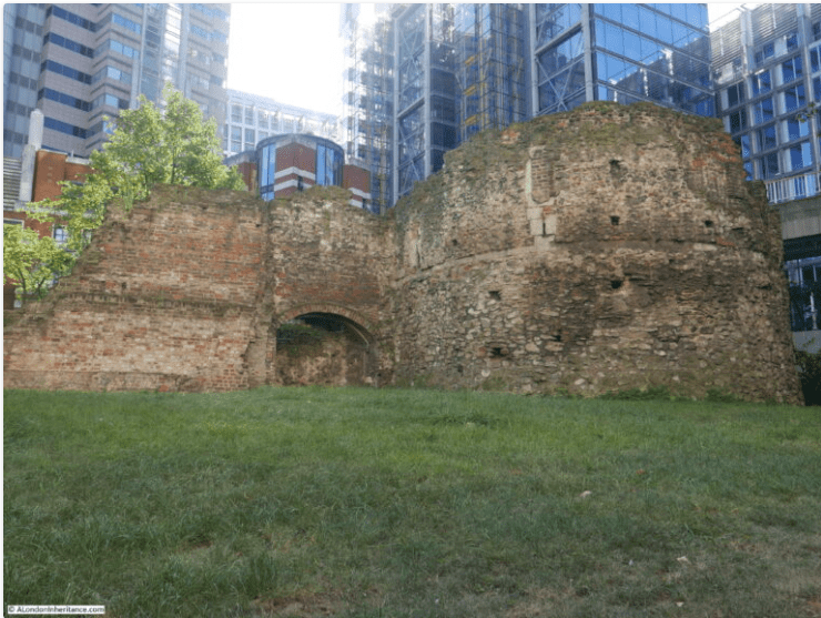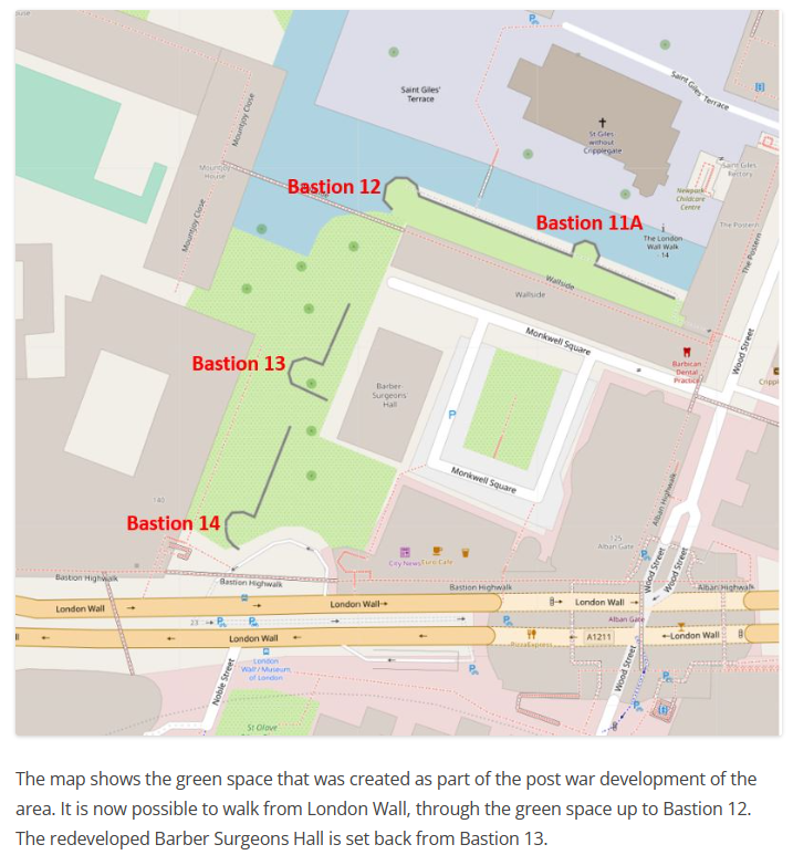 Now, I didn’t know that some of these bastions still existed, as you can read in this very interesting and detailed article Bastion 14, Cripplegate – A London Inheritance. The photograph at the top of this article, and the map immediately below here, have both been taken from the London Inheritance site.