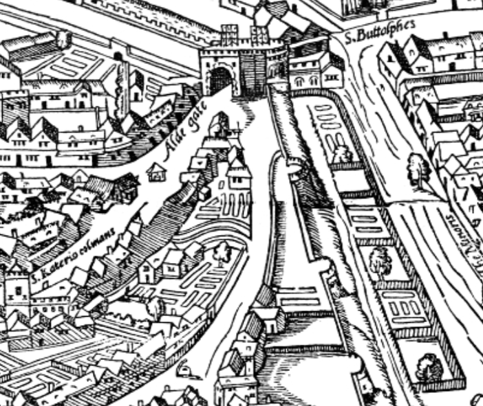 There were many other preparations for the expected invasion, of course, but I am writing about the bastions. I don’t know how many there were originally, but at least fourteen (see above). Three more feature in this extract from the later Agas map. From Aldgate the wall descends to close to bottom right, and the three bastions are clearly visible:-