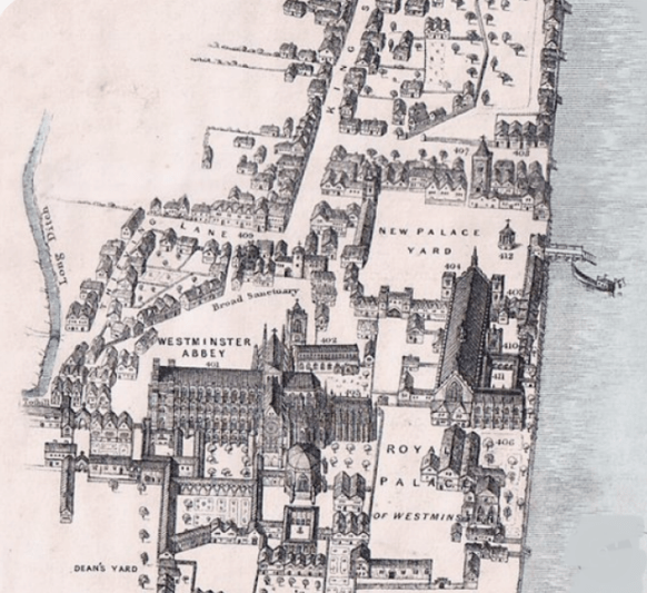 “….When he returned to Westminster from this….progress around the kingdom, he was met at the Watergate by St Stephen’s canons and Westminster Abbey’s monks for a procession to the abbey….”(b)