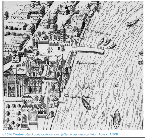 Westminster was centre of power, and therefore it was the place to be seen. It had (as far as I know) two main accesses from the river, one more exclusive upstream at the privy palace known as the Queen’s Stairs. The other was downstream at the Westminster Hall end of the palace, and known as….well, various names, but it seems it was eventually called the Watergate. I have seen it called the King’s Stairs, the King’s Bridge, Westminster Pier and so on and so on.
