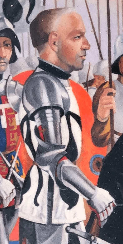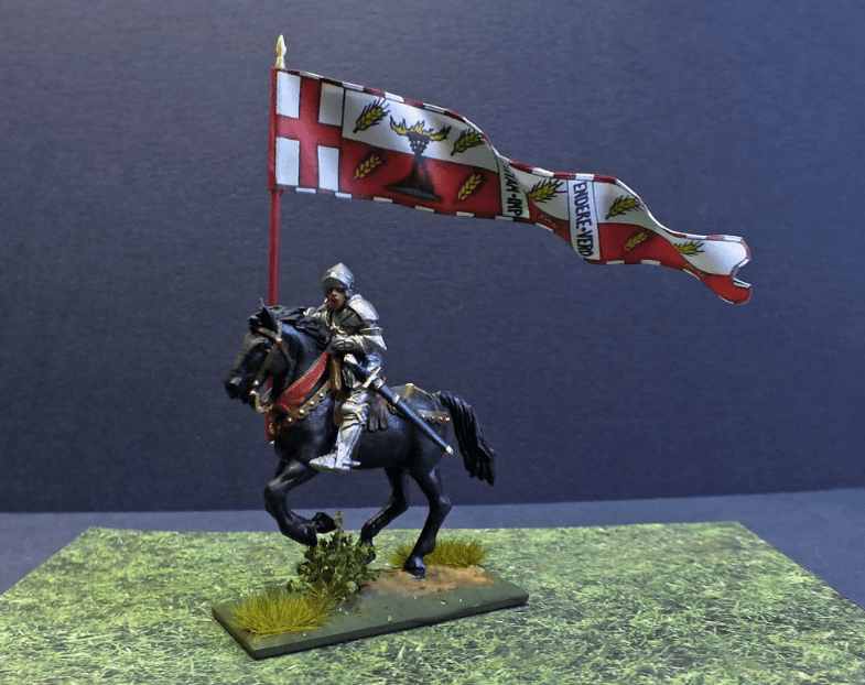 If the badge can definitively be linked to Henry Holand, I will retreat and say no more, but as a footnote I will add the image below. It shows a model of Henry Holand’s standard-bearer. The modelmaker is Robert (on Pinterest) and I know that immense care is always taken to be accurate with the heraldry. As you will see wheatears are shown clearly, and they do not have crowns. Just plain wheatears, such as his father and grandfather used. Dare I rest my case?
