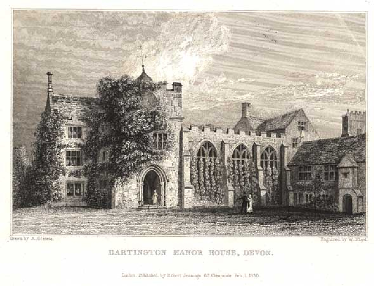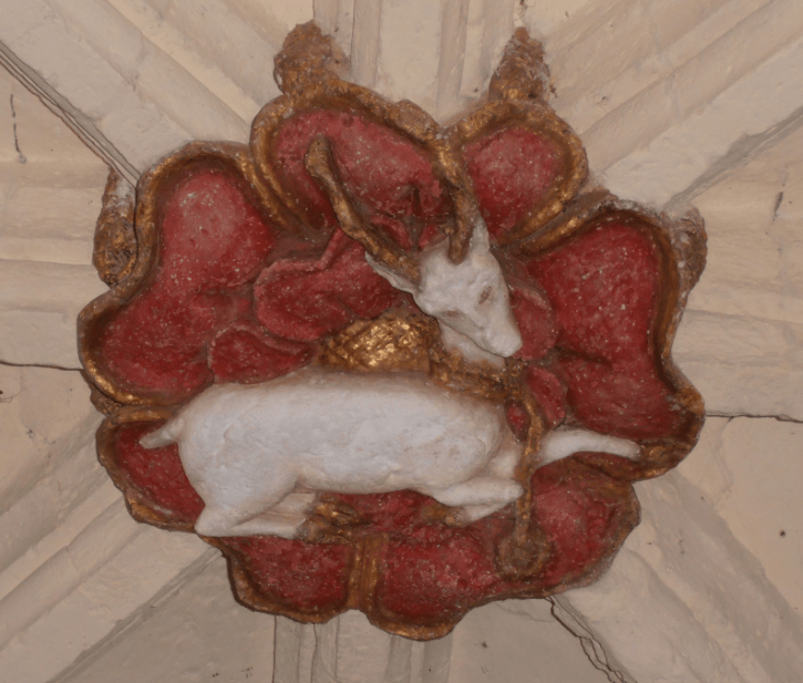 John’s favourite residence was to be Dartington Hall, near Totnes in Devon. He built it from a small, insignificant manor house that had been there before, and today it is both a college and a hotel. It’s also one of my favourite places, and I’ve stayed there a number of times. In the splendid medieval porch there is a ceiling boss that shows the white hart badge of Richard II, surrounded by roses. The roses have been painted red now, but it’s not known what colour they were originally. The same goes for the boss’s golden “trimmings”. The picture below doesn’t show it very clearly, but the golden projections (see on either side of the almost vertical lines at the top) are actually ears of wheat. It’s obvious when you’re in the porch looking up. They provide a very tangible link to John Holand because he had the porch built.