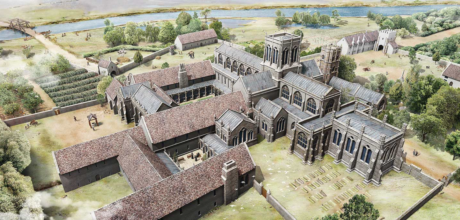 A reconstruction of Muchelney Abbey as it may have looked in about 1500. When complete, the church (right) would have dwarfed the adjacent parish church, which was rebuilt in the 15th century