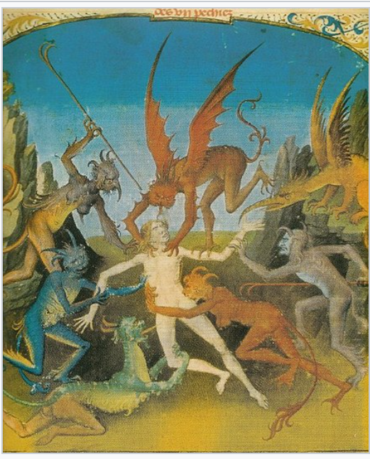 “….The 8th-century Latin Vita sancti Guthlaci, written by Felix, describes the entry of the demons into Guthlac’s cell:[4][5] […] they were ferocious in appearance, terrible in shape with great heads, long necks, thin faces, yellow complexions, filthy beards, shaggy ears, wild foreheads, fierce eyes, foul mouths, horses’ teeth, throats vomiting flames, twisted jaws, thick lips, strident voices, singed hair, fat cheeks, pigeon breasts, scabby thighs, knotty knees, crooked legs, swollen ankles, splay feet, spreading mouths, raucous cries. For they grew so terrible to hear with their mighty shriekings that they filled almost the whole intervening space between earth and heaven with their discordant bellowings….”