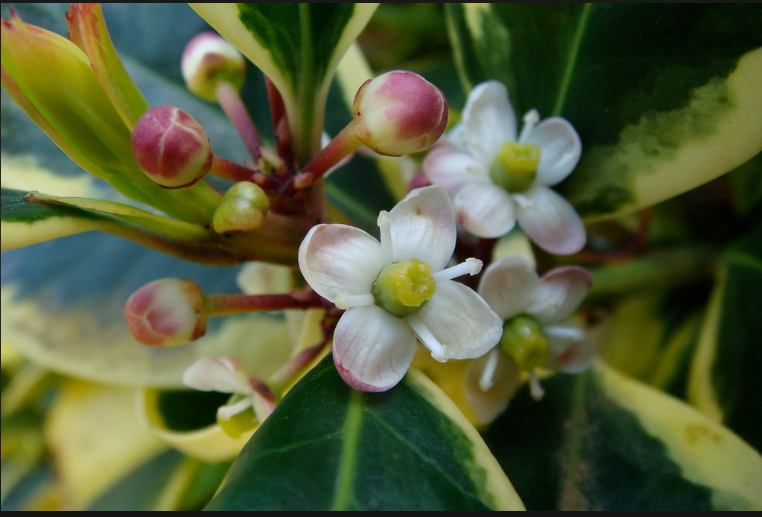 Holly is dioecious, a word I’d never heard before and which I at first read as delicious! Dioecious means that male and female flowers occur on separate trees. Flowers are white with four petals. They bloom any time between early spring and the very beginning of summer, depending on the climate. Now I know why the smooth-leaved variegated, very well established holly bush in my garden blooms exquisitely in the summer but never produces a single berry. It needs a male holly tree somewhere close by as a polleniser! Pretty much like humans. Please plant one, neighbours, because I really would like some berries.