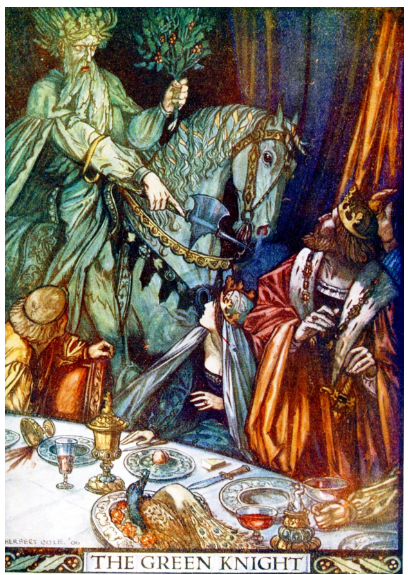 According to the mythology of the Celts, the Holly King reigned from the summer solstice to the winter, at which point the Oak King replaced the Holly King and reigned until the summer solstice came around again. The Holly King was thought of as a muscular giant covered in holly leaves and branches, and carrying a whole holly bush as a club. Perhaps the Green Knight of the Arthurian tale, which begins at Christmas, was actually the Holly King?