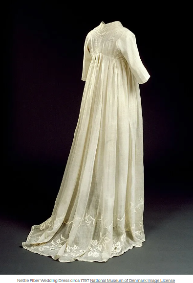 It’s hard to imagine that the fibres inside mature, woody nettle stems can be woven into fabrics as delicate as the 18th-century wedding dress below.