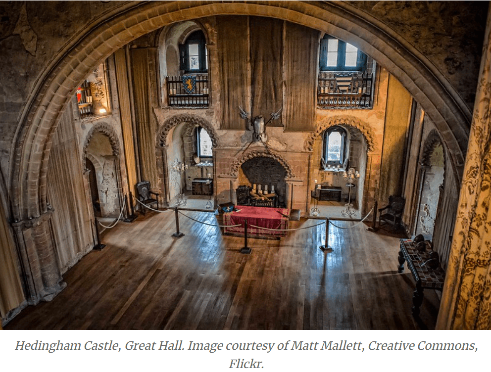 I recently watched an episode of Antiques Road Trip in which a sequence was set in Hedingham Castle in Essex. It was Series 11, Episode 23, in which art experts Mark Stacy and Thomas Plant travelled through Essex and Suffolk on their way to an auction in Cambridgeshire. I fear I have not been able to trace this episode online.