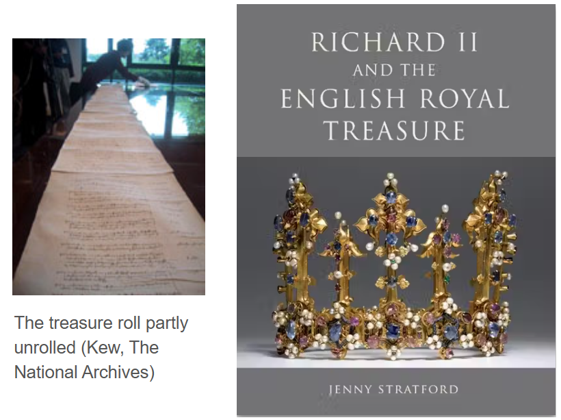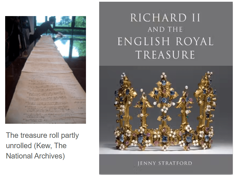“….The treasure roll [see top left] of Richard II, compiled in 1398/9, offers a rare insight into the magnificence of a late medieval English king. The roll, unknown until it was rediscovered in the 1990s, describes in exceptional detail the crowns, jewels, and other precious objects belonging to the king and to his two queens, Anne of Bohemia and Isabelle of France….”