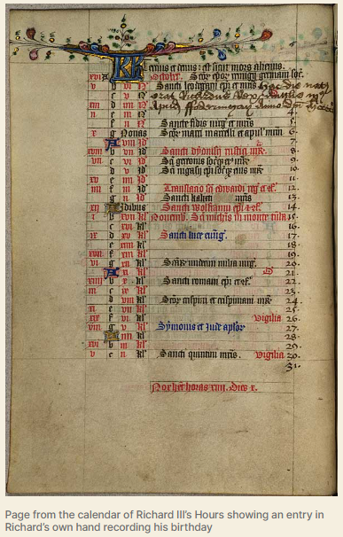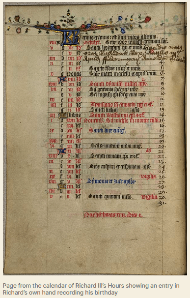 This image of his entry in the book of hours is taken from https://monumentoffame.org/2013/10/11/books-and-their-owners-ii-the-hours-of-richard-iii/.