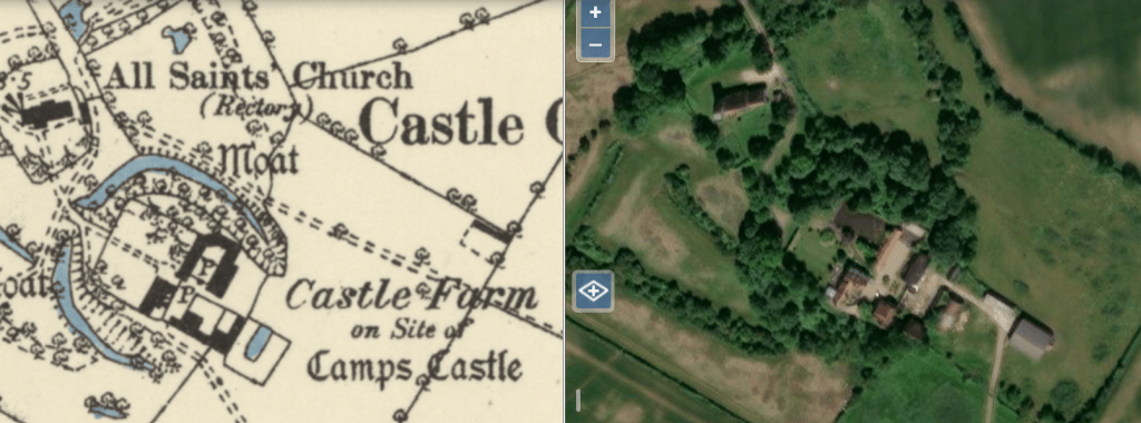 The ruins mentioned in the previous paragraph are described elsewhere as “….a piece of rubble in the yard to the South of the present farmhouse….” There’ll be more to be found under the ground, of course, but to all intents and purposes the castle at Castle Camps has disappeared. I haven’t been able to find a photograph of this rubble. The farm in question appears to have been known as Castle Farm, although I don’t know if it still is. See the map/aerial image below:-