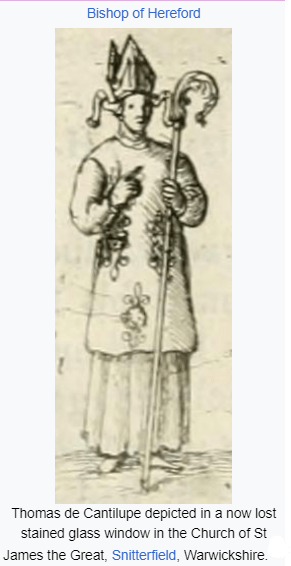 The other important fact about the Cantilupes, of course, is that they boast a saint, St Thomas de Cantilupe, Bishop of Hereford, who seems to have two feast days, 25 August and today,2 October. I haven’t investigated to find out why he has two.