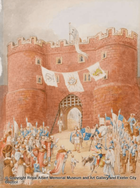 By 1483 Edward IV was dead and his brother Richard had become Richard III. (No need here to go into the nitty-gritty of that.) When reading Hoodman1’s excellent post https://murreyandblue.org/2017/03/20/richard-iii-in-exeter-a-painting-discovered/, I found the above illustration of Richard arriving at Exeter’s East Gate on his royal progress in that first year of his reign. He stayed from 9–13 November 1483, probably in the bishop’s palace. Hoodedman1’s post contains other useful information about Richard and Exeter. Thank you, hoodedman1 (and also Ian Churchward of The Legendary Ten Seconds). Unfortunately the West Gate is no longer there in its medieval form.