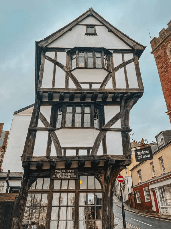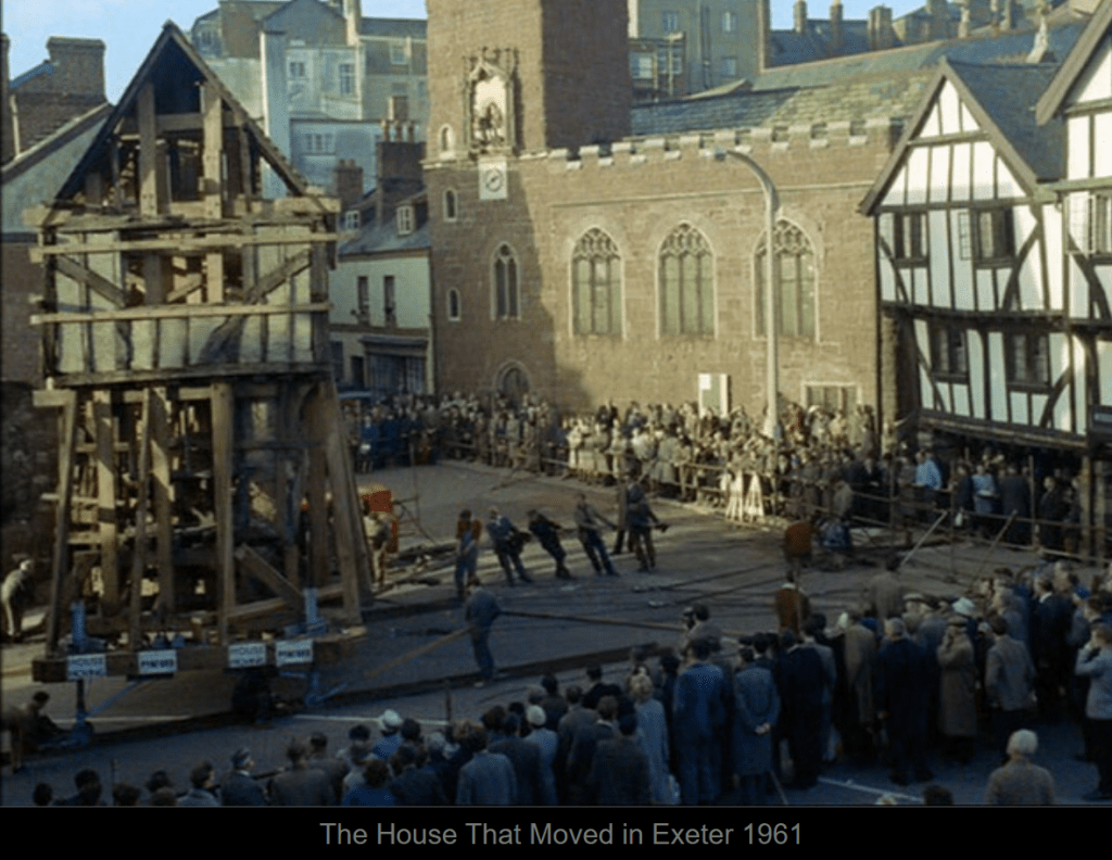 This plaque commemorates the original location of Exeter city’s west gate. It is near ‘The House That Moved’ (see below) and St Mary Steps church. It also commemorates some of the military campaigns in which it featured. From https://www.geograph.org.uk/photo/1727321