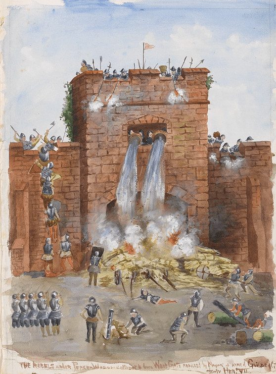 Perkin and his force of nearly 8,000 arrived at the city’s West Gate on 17 September 1497, St Lambert’s Day. But Exeter held out against him. (See illustration below) Sparkypus also refers to Coldridge—only eighteen miles away from Exeter as the crow flies—where Perkin’s older brother, Edward V, is now thought to have been living anonymously. The “Boys in the Tower” have now been virtually 100% proved to have survived, so might there have been a meeting between them as adults? Surely so if they were only eighteen miles apart. See here https://sparkypus.com/2021/04/13/a-portrait-of-edward-v-and-the-mystery-of-coldridge-church-part-ii-a-guest-post-by-john-dike/.