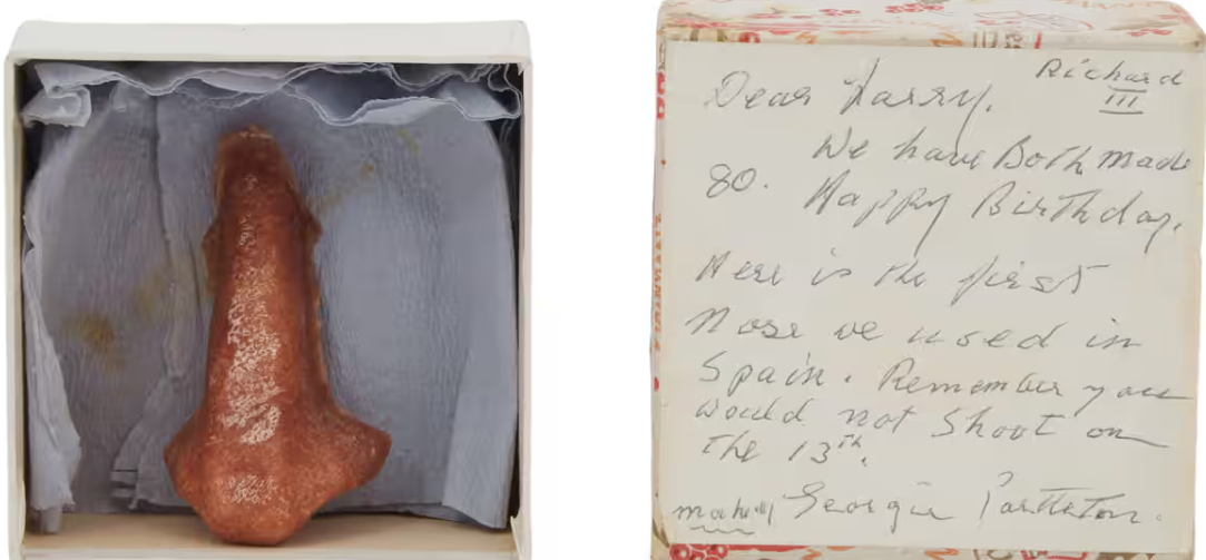 “….A prosthetic nose worn by Lord Laurence Olivier has been put on sale by his widow Dame Joan Plowright for £771, along with other items from the late actor….The Shakespearean actor, who was nominated for 11 competitive Oscars – taking home one for 1948’s Hamlet – wore the nose during his 1955 Academy Award-nominated Richard III performance….” It is estimated to sell for about £1,500. Dame Joan was his third and final wife, and nursed him through chronic illnesses, including cancer, until his death in 1989 at the age of 82.