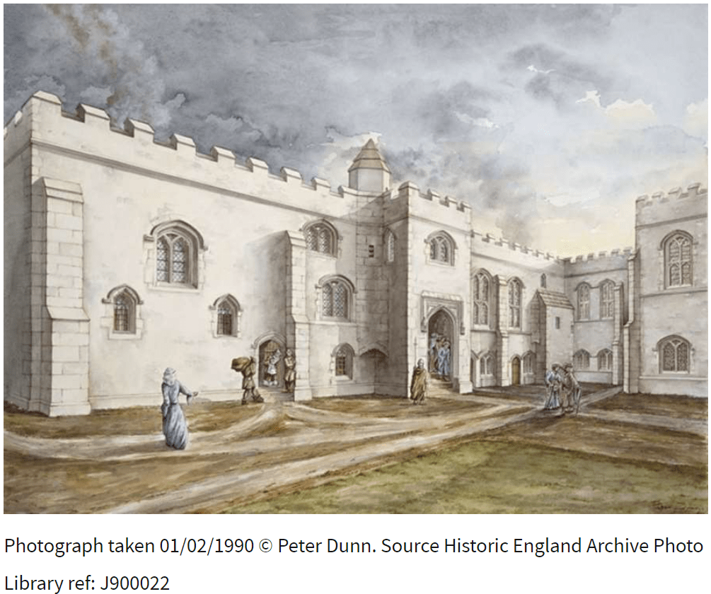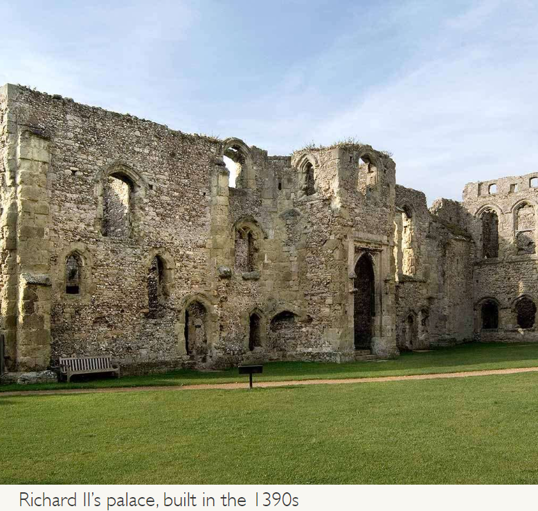 The above illustration is “….a reconstruction drawing of what the outside of Richard II’s palace would have looked like in the 14th century. As part of a reorganisation of the castle between 1396-99 Richard ordered the construction of a series of grand residential apartments for his use. The rooms included a kitchen, pantry, Great Hall, several chambers and a chapel. This property is now in the care of English Heritage (2012)….”