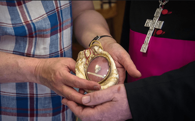 Anyway, as of 19 June 2018 the relic has been safely at Westminster Cathedral. “It was presented to the cathedral by Mr. James Rubin of Environ Waste and was received by Archbishop George Stack, who serves as the chair of the Patrimony Committee of the Bishops’ Conference of England and Wales….The relic will be on display at the Treasurers [sic] of Westminster Cathedral Exhibition, which is available to visit by the general public.” See here https://westminstercathedral.org.uk/the-cathedral/treasures/.