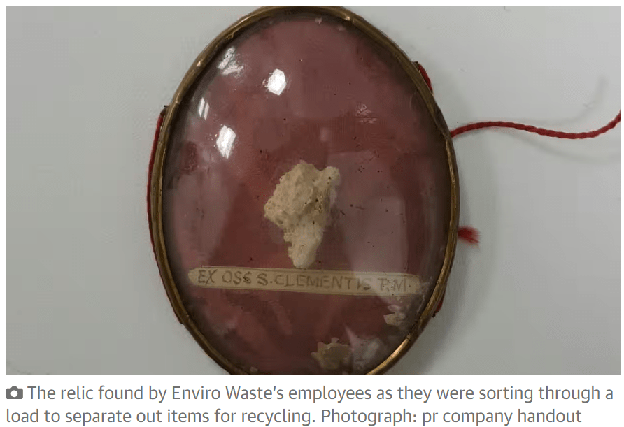 The contents of my bin will be household waste. Period. But back in May 2018 a beautifully set relic (a bone) of St Clement (1st century Pope and martyr, whose feast day is today, 23 November. See https://www.catholic.org/saints/saint.php?saint_id=37) was found in a central London bin by waste collection company Enviro Waste. Yes, really. You can read about it here https://www.theguardian.com/uk-news/2018/may/01/relic-claimed-to-be-bone-from-st-clement-rescued-from-the-bin, here https://rcadc.org/relic-of-st-clement-found-in-trash-now-in-safe-keeping-at-westminster-cathedral/ and here https://www.cbcew.org.uk/relic-of-pope-st-clement-i-goes-on-display-in-westminster-cathedral/
