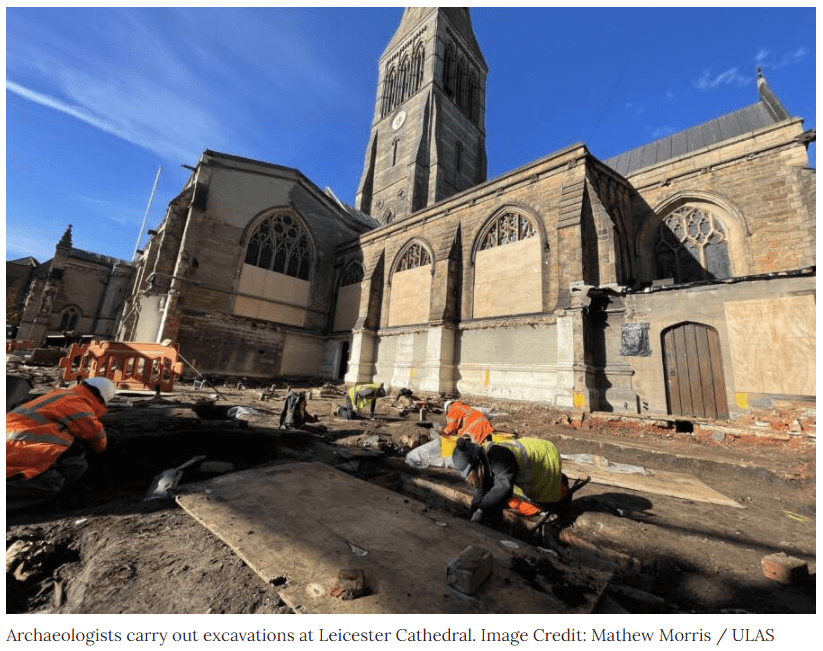 One of the largest mass-burial sites ever found in the UK has been discovered next to Leicester Cathedral. It contains “….the skeletal remains of 123 men, women and children dumped down a narrow vertical shaft in the early 12th century….’Their bones show no signs of violence – which leaves us with two alternative reasons for these deaths: starvation or pestilence,’ said Mathew Morris, project officer at Leicester University’s archaeological services. ‘At the moment, the latter is our main working hypothesis.’….”