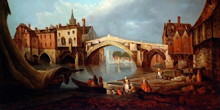 In the early 14th century the original timber bridge was replaced by a Gothic stone structure with pointed arches and elaborate detailing. At first it consisted of three large arches to allow the passage of boats and relieve the risk of flooding due to constricted flow. Well built and well surfaced, it allowed traffic to move easily to and fro on top, as well as the Ouse to flow freely below. It was “….lined with shops and houses, which created a bustling atmosphere and contributed to the economic vitality of the area….These buildings, with their overhanging timber frames, provided a unique charm and character, as well as additional shelter for traders and travellers….” (from https://www.exploringgb.co.uk/blog/old-ouse-bridge-york).