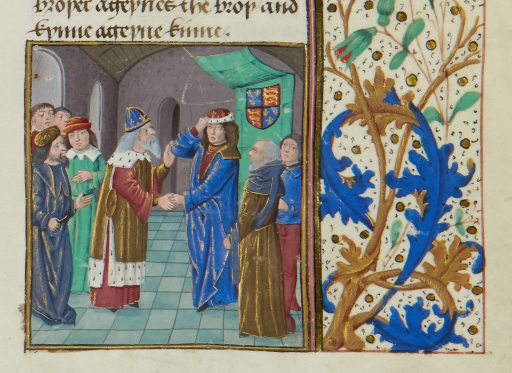 In the above image Bolingbroke/Henry IV looks as if the crown (for which he’d murdered the true king, Richard II) is prone to slipping off his unworthy head! No one else in the picture looks particularly comfortable either. Oh, dear. Please relax, for I’m not going to say anything more about this. Honest. My hobby horse stays in the stable this time because it’s the distinguished visitor with whom I’m concerned, not the odious Bolingbroke.