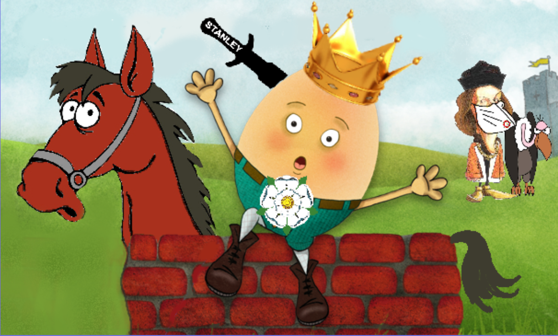 There are various theories as to the origin of the rhyme. One is that it refers to Richard III. The theory was first set forth by Katherine Elwes Thomas in 1930 in The Real Personages of Mother Goose. The theory was propagated by Robert Ripley.[1] Thomas speculated that because Richard was “humpbacked” and because he lost at Bosworth, despite “all the King’s men”, King Richard was Humpty. Richard, of course, was never described as chubby. Indeed we now know him to have been of a slight build. Again, the original version of the rhyme does not refer to the “king’s men” but to “four-score men and four-score more”. Other than Thomas’ speculation there is no evidence of any kind linking Bosworth to the rhyme.