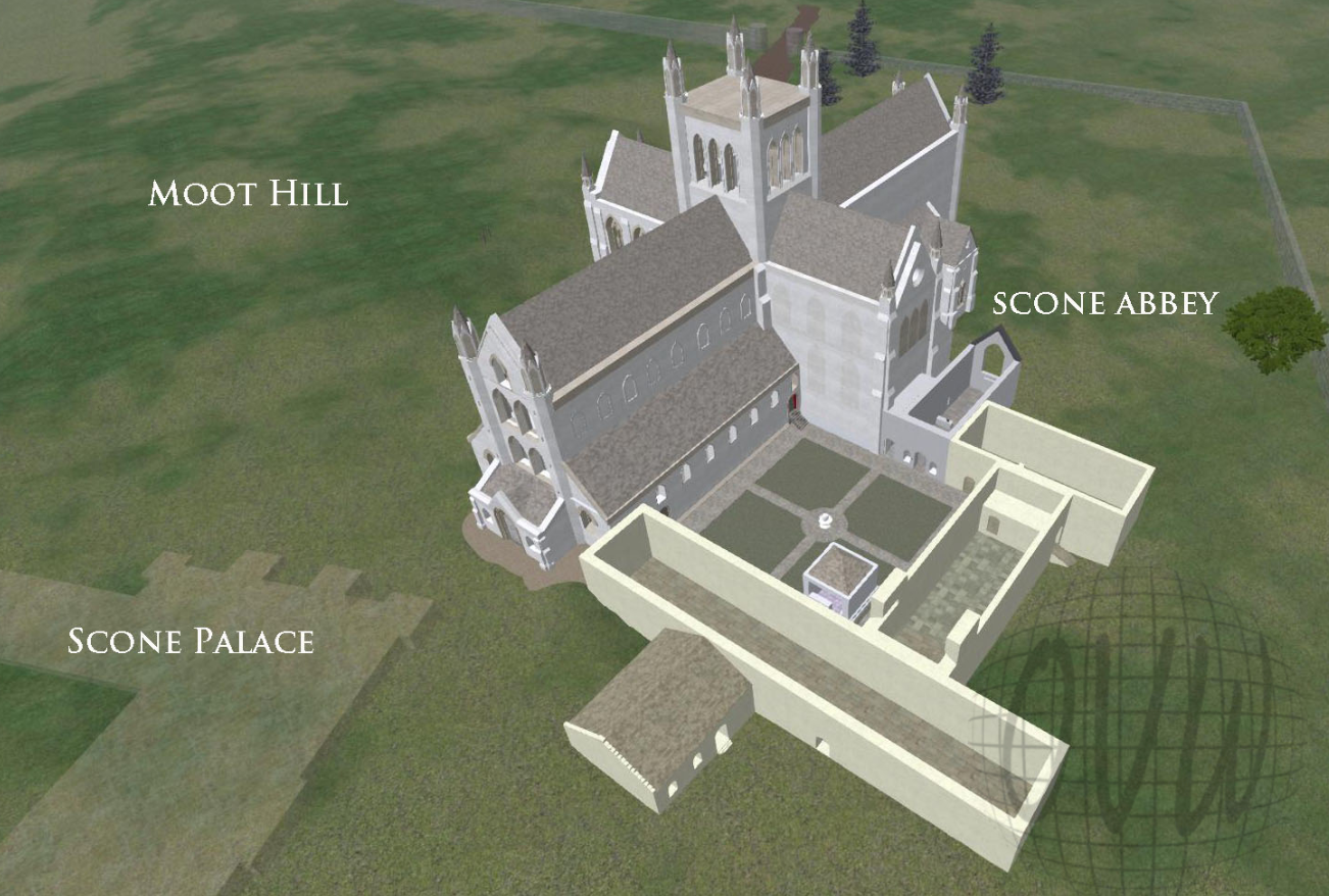 Scone Abbey circa 1390 – There are other reconstructions of Scone Abbey at this site http://www.openvirtualworlds.org/scone-abbey/