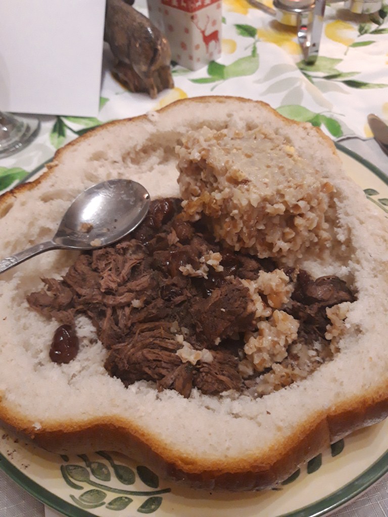 This is a stew, in this case made with venison. I served it on bread trenchers, which I got in the supermarket – I think they are called cob loaves. They are round, plate-sized (luckily!) and flattish. If you’re very clever (or mad) you can make it yourself. I sliced them horizontally, making two ‘trenchers’ from each loaf.