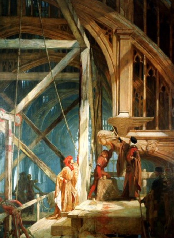 We all take for granted that the hammerbeam roof of Westminster Hall (see https://www.parliament.uk/about/living-heritage/building/palace/westminsterhall/architecture/the-hammer-beam-roof-/) is a true masterpiece of medieval workmanship and innovation. Many of us know that the transformation of the (then) huge building was at the instigation of Richard II. But how many of us know of a painting that captures a fleeting moment when Richard and his master carpenter, Hugh Herland, (see https://en.wikipedia.org/wiki/Hugh_Herland) are inspecting the progress of the new roof? The great master mason Henry Yevele (see https://en.wikipedia.org/wiki/Henry_Yevele) was responsible for transforming the entire hall. What an astounding metamorphosis it must have been after the austere Norman presence of the original.