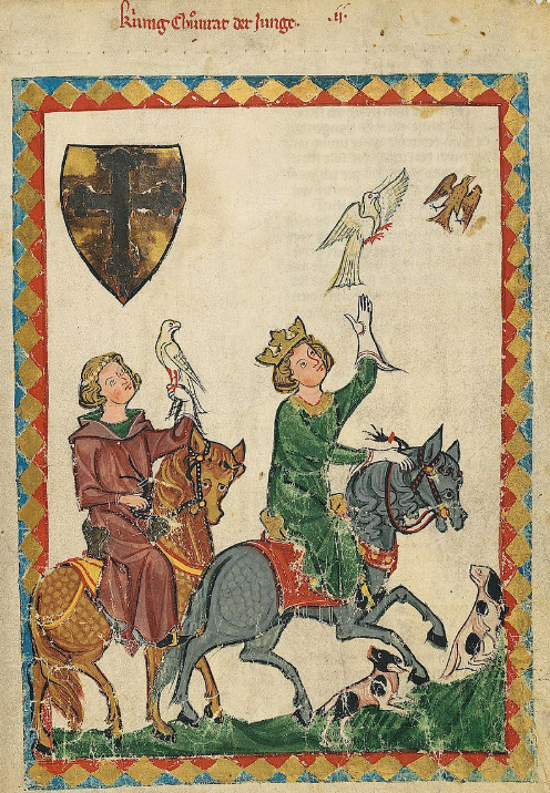 King Conrad the Younger (1252-1268 https://en.wikipedia.org/wiki/Conradin) was King of Jerusalem, Sicily and Duke of Swabia, and only sixteen when he fell into the wrong hands and was beheaded. But in his short life he’d enjoyed hawking, and below is a famous illustration of him indulging in the sport.