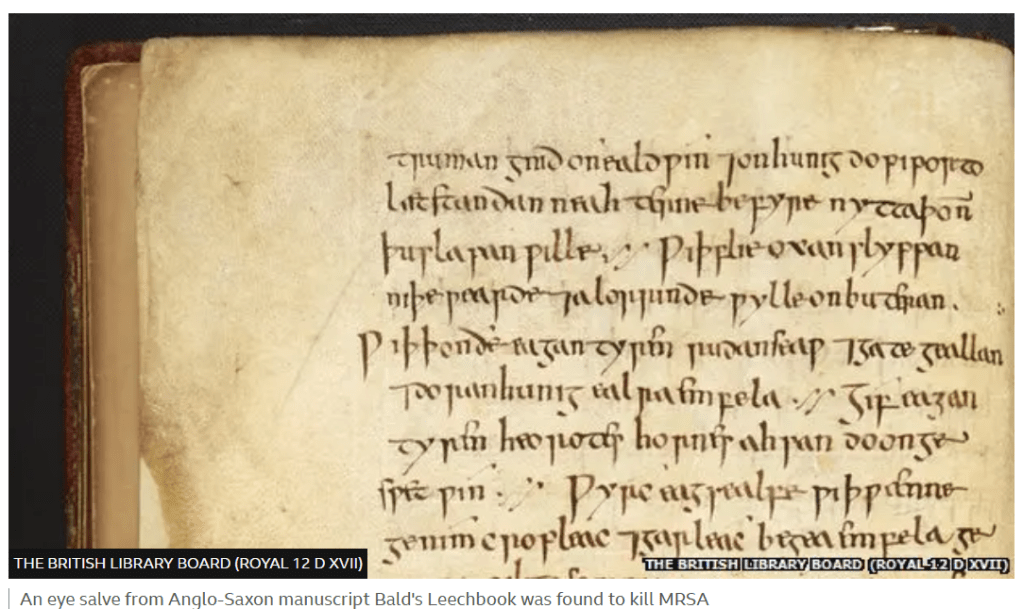 Anyway, in tests it has been found that a 9th Century Anglo-Saxon remedy for eye infections (using onion, garlic and cow bile), “….almost completely wiped out methicillin-resistant staphylococcus aureus, otherwise known as MRSA….” The remedy was found in Bald’s Leechbook – an old English manuscript held in the British Library containing instructions on various treatments.
