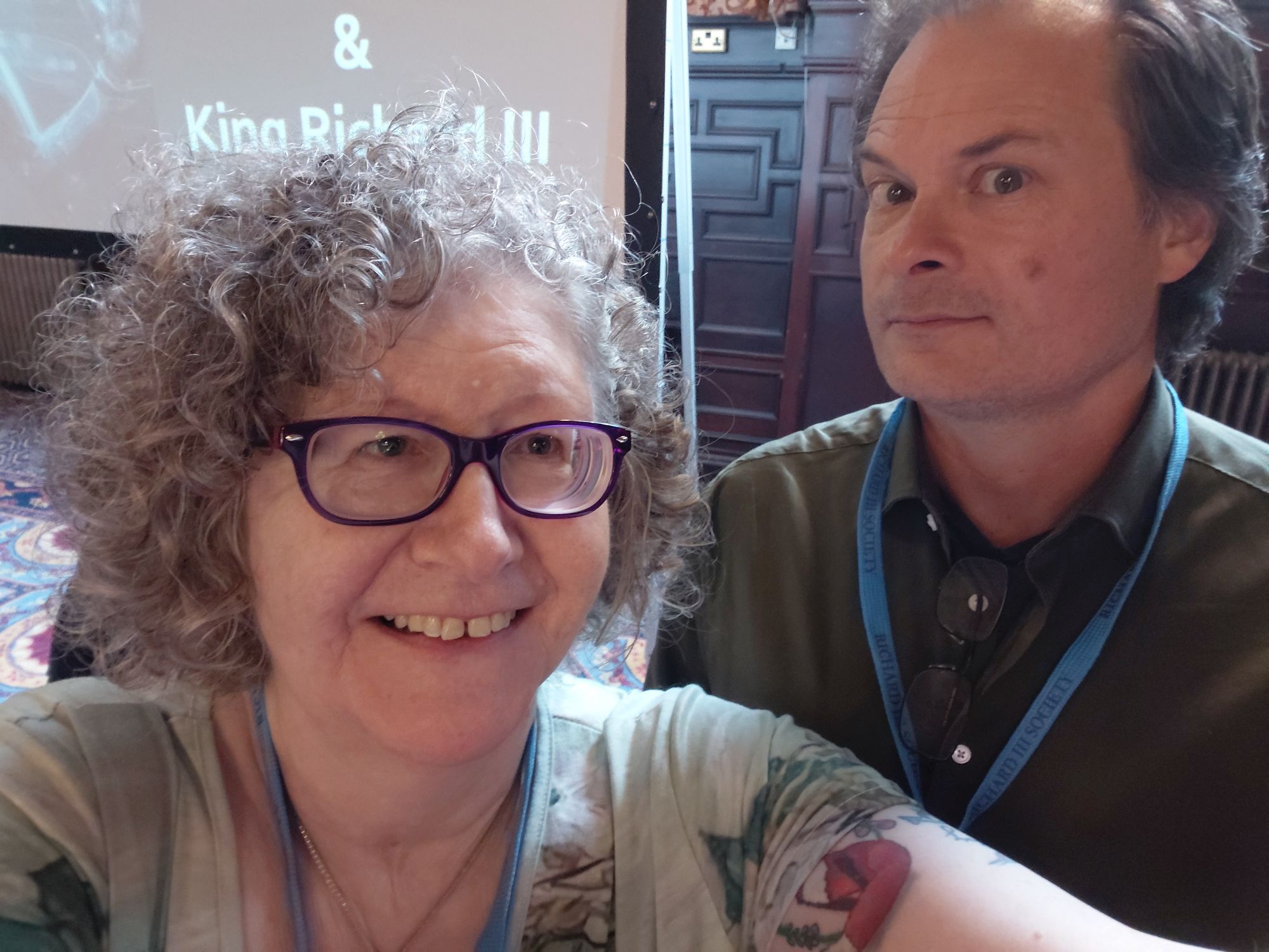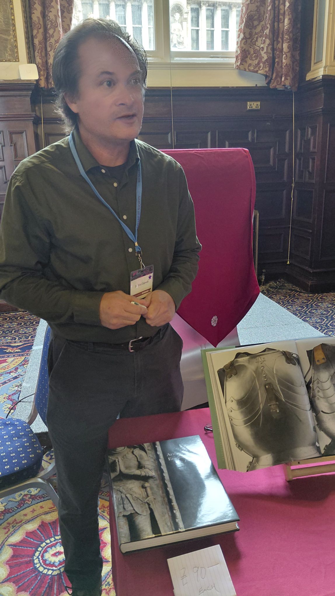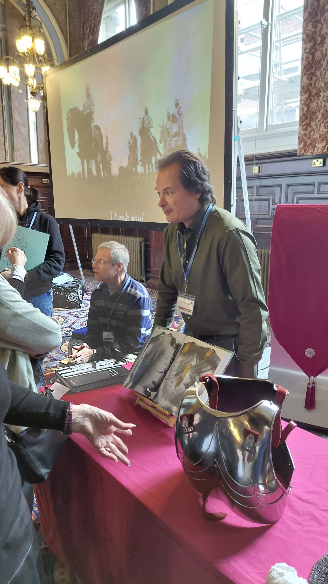 After time for a coffee, we all entered the hall for an excellent talk by Dr Tobias (Toby) Capwell and Dominic (Dom) Smee. They hadn’t met since they took part in the documentary follow-up to The King in the Car Park, called Richard III: The New Evidence. It was very relaxed and entertaining, with Toby remembering how he had become involved with Philippa Langley and the Looking for Richard project, and Dom describing the difficulties and challenges he had had to overcome in order to become Richard’s ‘stunt double’ (as Toby described it). He proved that Richard would have been capable of fighting, riding, charging and using weapons. In fact, Richard would have been very used to this, whereas to Dom it was all new as he’d only had a few months to train.