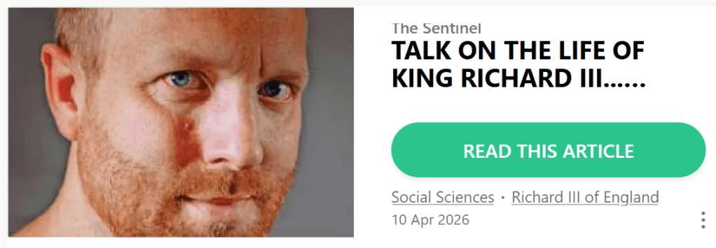 “….The Ancient High House in Stafford is the set­ting for the insight into the king’s life on Sat­urday, May 9, from 4.30pm to 5.30pm….Titled ‘Richard III & Shakespeare’, the event will be led by acclaimed his­tor­ian and author Matt Lewis…..”